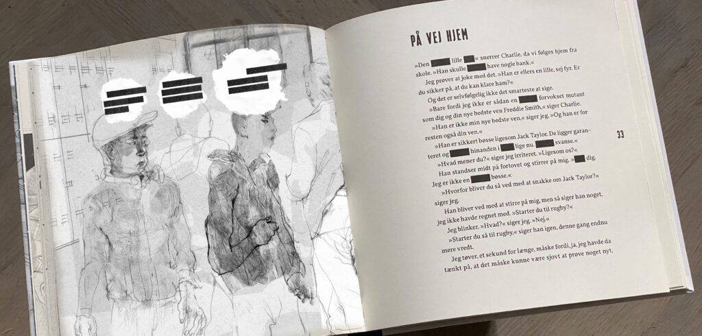 ”Tegningerne skal bidrage med følelserne. Introducere miljøet, introducere fire drenge, lære dig dem at kende, vise dem og deres omgivelserne frem. I starten syntes jeg kun, at jeg kunne ødelægge den. Men jeg tror faktisk, at jeg giver noget, som handler om netop alle stemningerne mellem drengene. Et bud på hvad det kunne være. Jeg kunne lige så godt illustrere den igen, og gøre det på en helt anden måde. Det er det, der viser, at det er sådan en god tekst. Jeg kunne lave fem andre versioner med forskellige illustrationer og forskellig streg. Men jeg valgte blyanten. Og blødheden,” siger Tea Bendix.