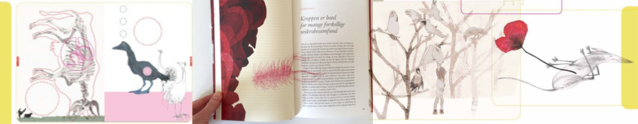 Pludselig samler indtrykkene sig, tingene begynder at blive til. Jeg færdiggør illustrationerne, scanner ind, tilpasser detaljer i Illustrator og Photoshop, håndskriver typografien, udfører bogtilrettelægning og design i Indesign, klargør pressemateriale og animerer i After Effects og afprøver hele tiden layoutet for at se, hvordan samspillet mellem de mange dele virker i praksis. Undervejs sender jeg kunden eksempler på, hvad jeg arbejder med. Jeg udfører alle dele af processen fra ide til tryk. Det føles som at moddelere det op. Det er et lykkeligt puslearbejde og det er vigtigt at alle detaljer omkring bogen hænger godt sammen, især hvis det udvikler sig til at blive til mange ting og flytter over i andre medier.