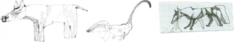 Man må undersøge det ved at gå igang. Jeg skriver tekster, tegner mig ind på nogle visuelle elementer, jeg kan anvende, vender og drejer temaet, fylder væggen op med skitser, vælger ud. Når man læser for at illustrere, får man øjne for en masse fine lag i manuskriptet eller temaet, tusinder af muligheder som man kunne arbejde med, en masse ting man må vælge fra også !!! Gradvist vokser en måde frem, hvorpå tekst og tegning kan supplere og give energi til hinanden.