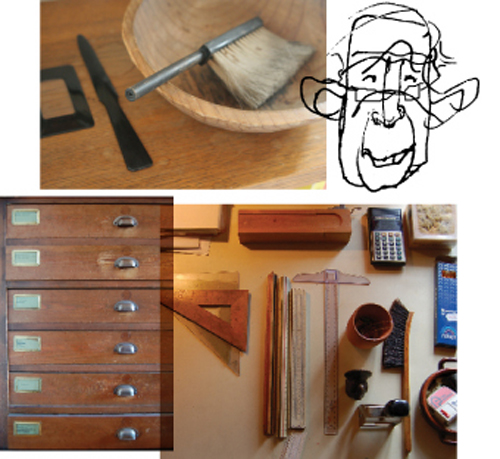 Nu har jeg min endelig min egen tegnestue, hvor jeg arbejder med billedbøger, børnelitteratur, børneradio, børneteater. (Min bror måtte også både have modelværksted og skråbord med hovedlineal.) Og her står den så, tingen, i min tegnestue: Tolv skuffer til papir i store formater, akvarelæsker, originaltegninger og plads til flere. Og der er visse af disse skuffer, navnlig nummer to fra venstre, der dufter HELT som de skal, muligvis af blystifter eller trækpapir, jeg ved det ikke. Morfar har ladet mig arve unævnelige skatte: specialbørste til viskelædersmulder, hans håndtegnede (håndtegnede !) papirlinialer og vigtigst: en damehånd af træ hvorpå man kan hænge gummielastikker, de brede til pakker.
