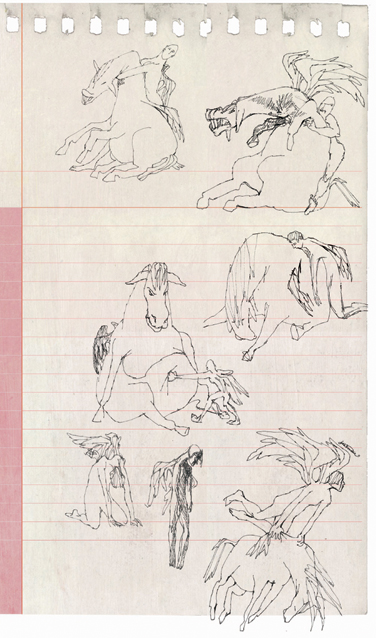 ”I den her tegning har jeg brugt en croquistegning som direkte inspiration. Og så har jeg bare lagt alt muligt indover. Det er en tidligere skitse til forsiden på bogen, hvor du kan se, at jeg har arbejdet med at give ham en trøje på uden på det nøgne, så han har den der følelse af at være så meget krop, selvom han er klædt på,” siger Tea Bendix.