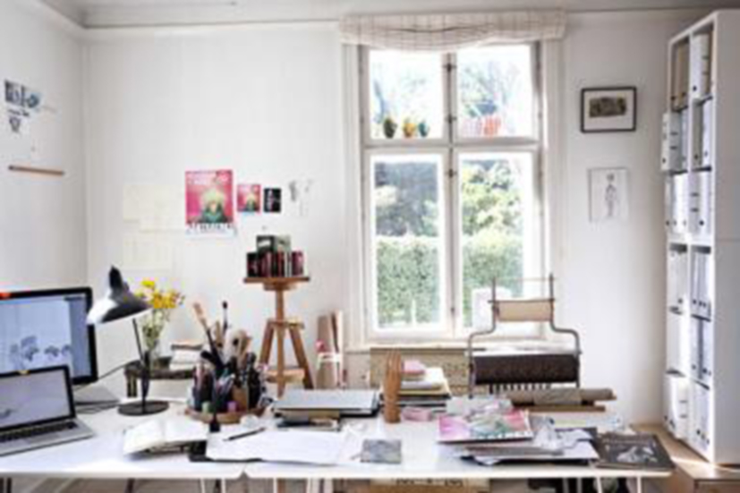 Arbejdsrum. Det er tirsdag og der står med kort varsel en fotograf. Jeg burde arrangere det lidt, men jeg kan pludselig ikke huske hvordan min tegnestue egentlig ser ud. Det er et rum der aldrig falder i form. Bogstakke og tegninger vandrer fra gulvflade til bord og væg i prioriteret rækkefølge. Inpirationsmateriale åbner og lukker sig. Processen SKER via rummet. Rummet ER processen … og processer falder aldrig i form. Et øjeblik er der stille, fotografen tager sit billede. Straks efter nye skitser på væggene. Bordet samlet til et kvadrat. Tirsdag så det sådan ud.