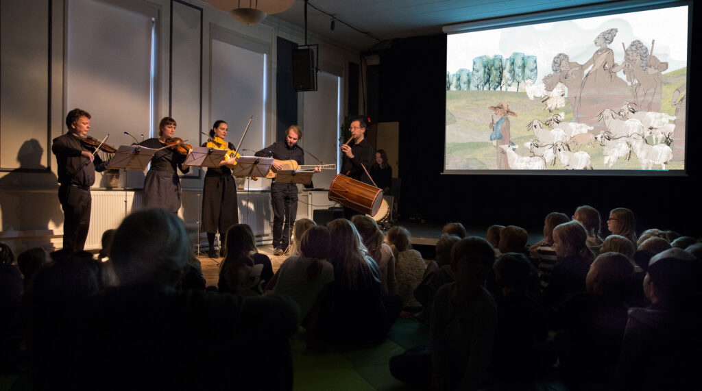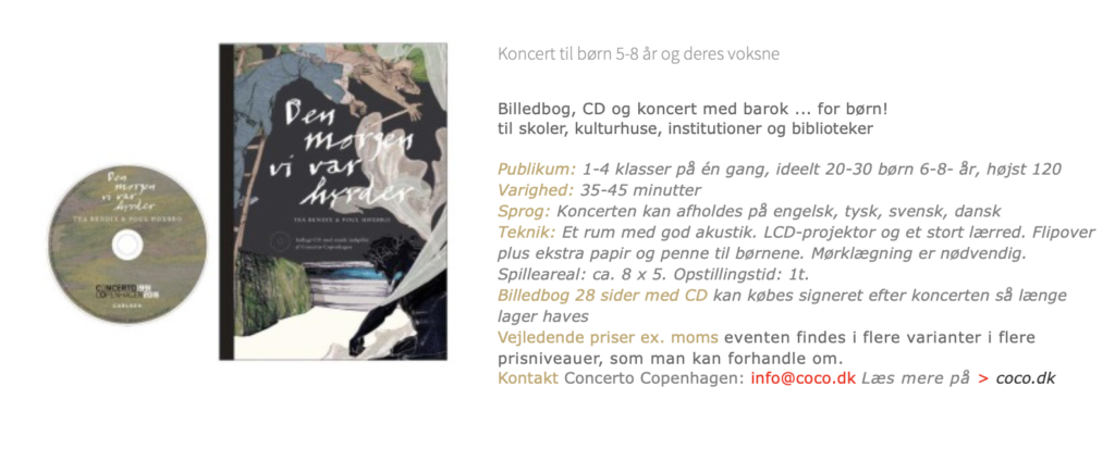 Billedbogskoncert · Concerto Copenhagen: Fredrik From, Hannah Tibell, Jesenka Balic Zunic, Fredrik Bock og Poul Høxbro · Illustrationer på storskærm ved Tea BendixDen morgen vi var hyrder, illustration fra billedbogskoncertenDen morgen vi var hyrder · Barokmusik for børn · Link til SpotifyDen morgen vi var hyrder · Billedbogskoncert· Barokmusik for børn · info