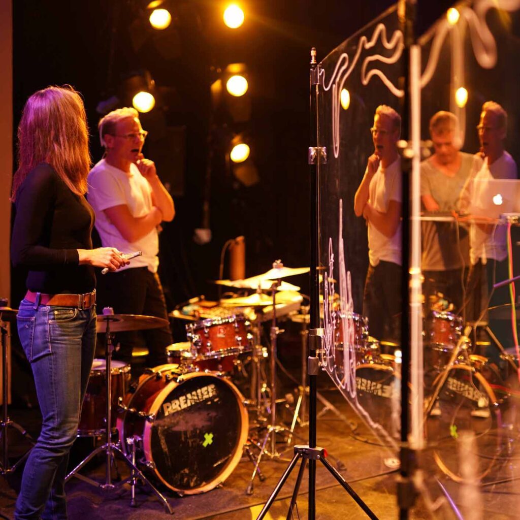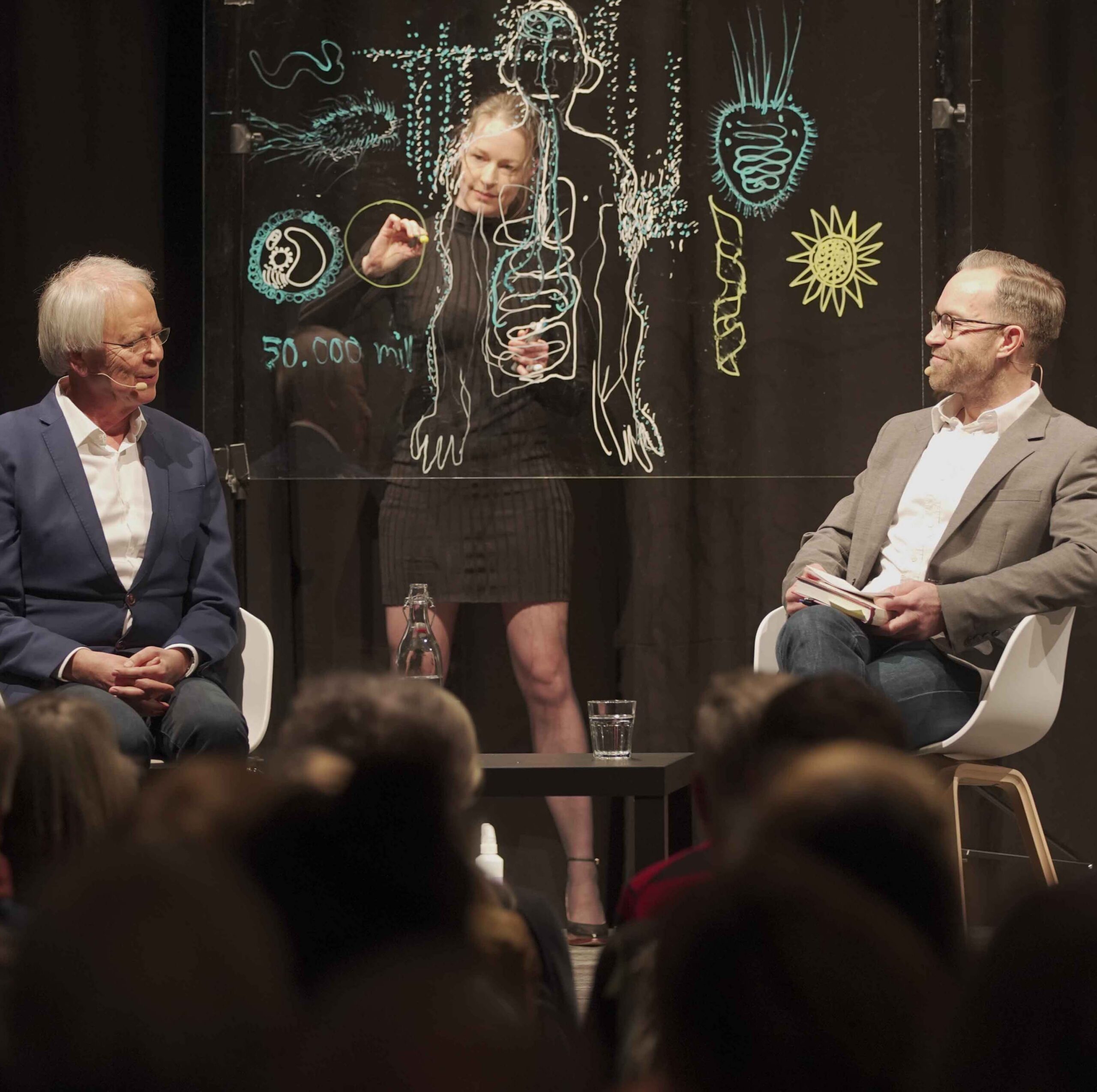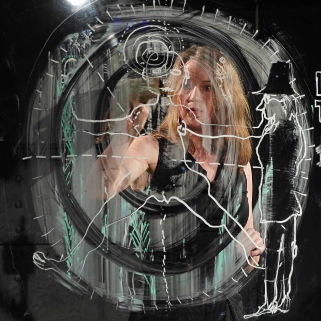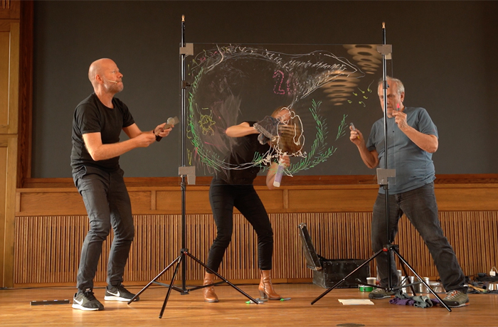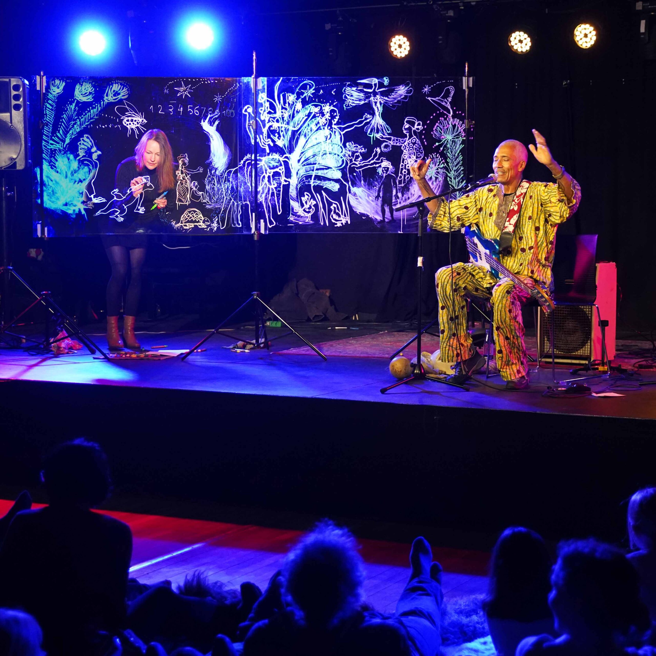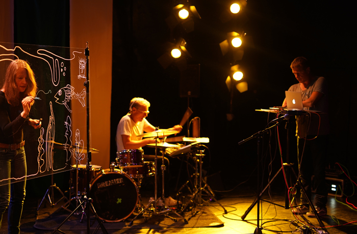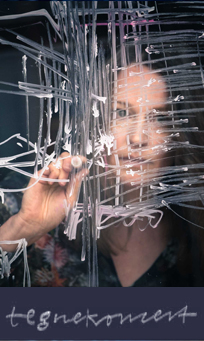Jeg tager tegningerne med på scenen i form af tegnekoncerter / illustreret performance / livetegning i samarbejde med musikere, dansere og skuespillere.